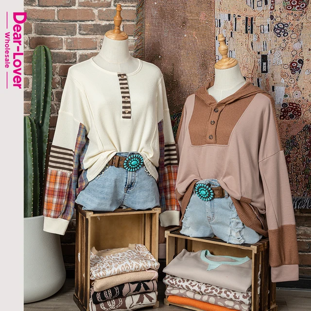 Dear-Lover Wholesale Boutique Women Western Chic Waffle Stripe Plaid Patchwork Henley Knit Long Sleeve Top