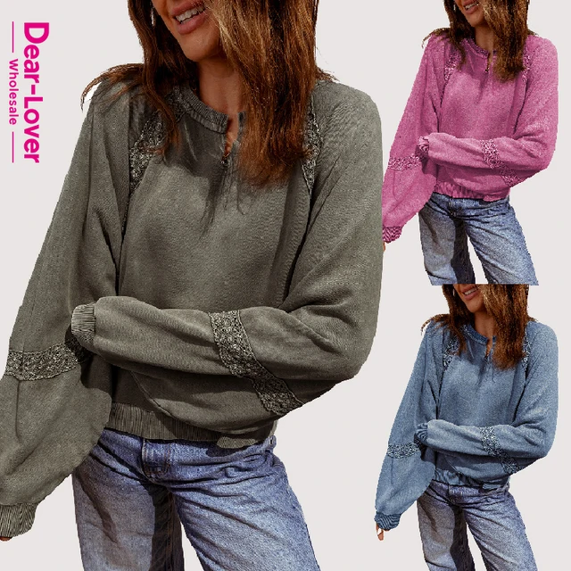 Dear-Lover Wholesale High Quality Vintage Lace Patchwork Detail Notched Neck Mineral Wash Baggy Pullover Women Sweatshirt
