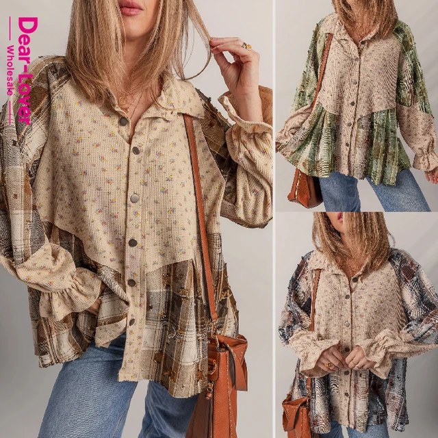 Dear-Lover Wholesale Boutique Boho Bohemian Floral Plaid Patchwork Distressed Detail Ruffled Sleeve Waffle Knit Shacket Women