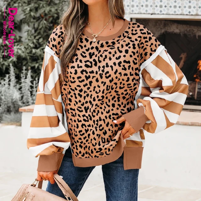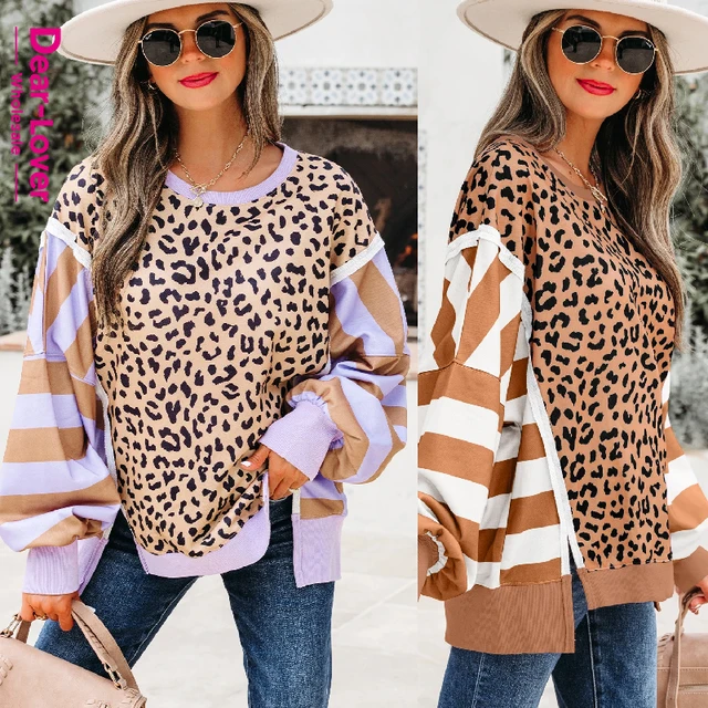 Dear-Lover Wholesale Boutique Fashion Western Chic Striped Color Block Patchwork Leopard Printed Oversized Sweatshirt Women