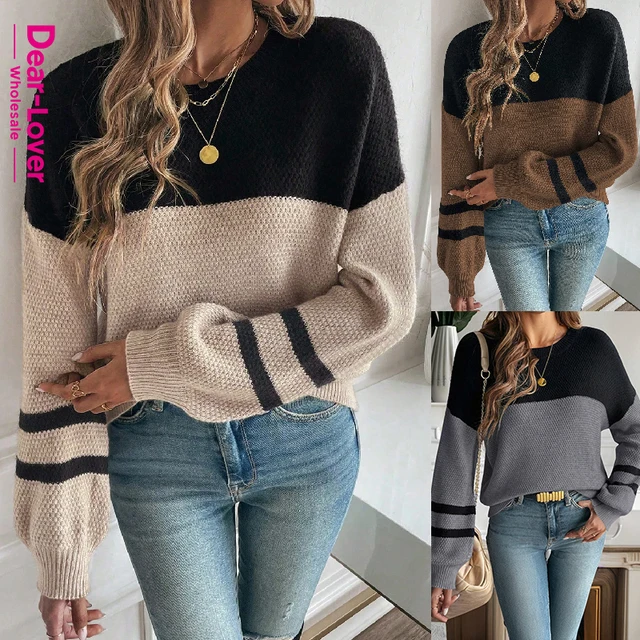 Dear-Lover Wholesale Boutique Winter Color Block Knit Striped Sleeve Detail Casual Patchwork Sweater Women