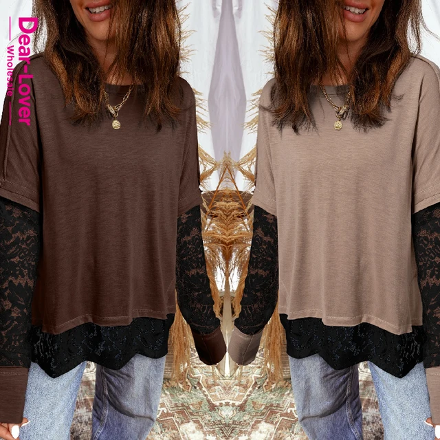 Dear-Lover Wholesale Bulk Fashion Boutique Clothing Women Sheer Lace Patchwork Casual Plain Long Sleeve Tee Shirt
